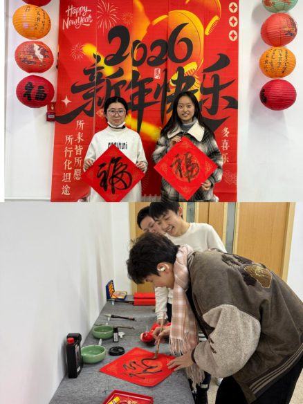 下午2时许,联谊会在欢快的暖场音乐中拉开序幕,师生们陆续签到入场。活动设置了写福字互动区,笔墨纸砚整齐摆放,书法爱好者们挥毫泼墨,笔走龙蛇间,一幅幅寓意吉祥的 “福”字跃然纸上,承载着美好祝愿,为现场增添了浓厚的年味。